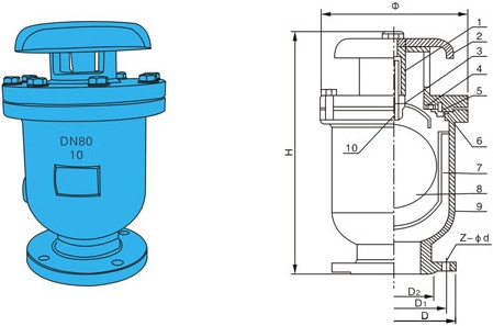 當(dāng)水進(jìn)入管道時(shí),塞頭停在定浮球上部,進(jìn)行大量排氣,當(dāng)空氣排完時(shí),水入閥內(nèi)把球浮起,傳動(dòng)塞頭到關(guān)閉,停止排氣。管道在正常運(yùn)轉(zhuǎn)時(shí)自然會(huì)產(chǎn)生少量氣體,這些氣體全聚集到管道上部,到相當(dāng)程度,閥內(nèi)水位下降,浮球順?biāo)陆禋怏w從小孔排出。如出現(xiàn)停電、停泵,管內(nèi)水流空時(shí)隨時(shí)會(huì)出現(xiàn)負(fù)壓,浮球順?biāo)陆担蜷_小孔帶動(dòng)大孔進(jìn)行大量進(jìn)氣確保管道安全。