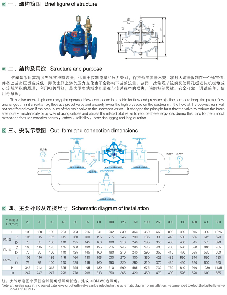 產品特點:工洲牌400x流量控制閥,是一種采用高精度先導式方式控制流量的多功能閥門。適用于配水管需控制流量和壓力的管路中,保持預定流量不變,將過大流量限制在一個預定值,并將上游高壓適當臧低,即使王閥上游的壓力發(fā)生變化,也不會影響主閥下游的流量。該閥一改常規(guī)節(jié)流閥使用孔板或純機械地臧小流域面積的原理,利用相關導閥,大限度地減少能量在節(jié)流過程中的損失。如遇緊急情況400XA流量控制閥可以完全截止流量避免損失。控制靈敏度高,安全可靠,調試簡便,使用壽命長。