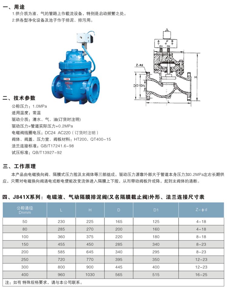 J841X系列電磁液(氣)動隔膜排泥閥由電磁換向閥,隔膜式壓力腔及主閥體等三部分組成。驅動壓力源靠外部大于管道壓力加0.2MPa左右長期供應,只需對電磁換向閥通電或斷電便能改變流體進入隔膜上下腔,從而帶動閘板升或降,氣到主閥體的通斷