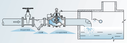 口向水池注水,實(shí)現(xiàn)自動補(bǔ)水.液位控制精度準(zhǔn)確,不受水壓干擾;100X隔膜式遙控浮球閥可隨水池的高度及使用
